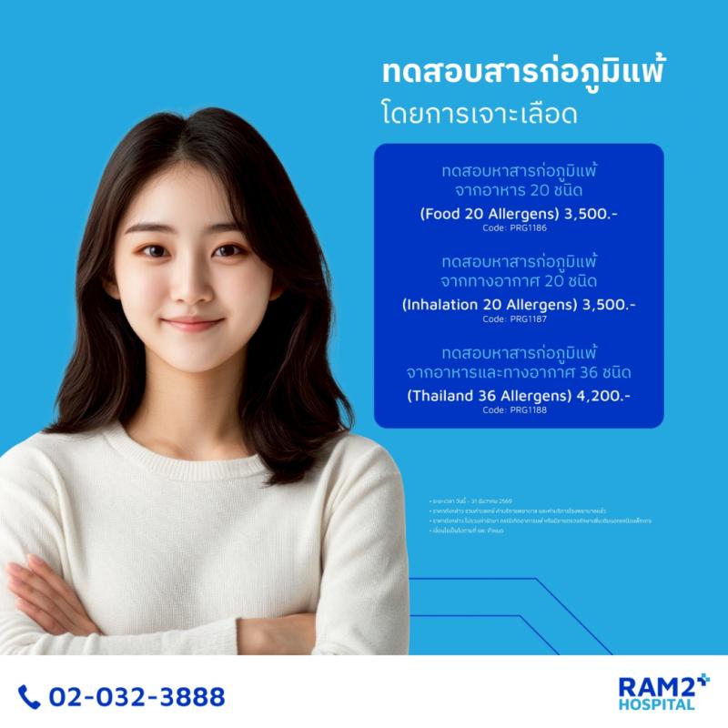 - ราคาดังกล่าวไม่รวมค่าตรวจประเมินก่อนการทดสอบ เช่น ตรวจ Skin Prick test หรือการตรวจ Specific IgE กรณีต้องใช้ร่วมในการวินิจฉัย, ค่ายากรณีทดสอบการแพ้ยา ค่ายา - ค่ารักษากรณีเกิดอาการแพ้